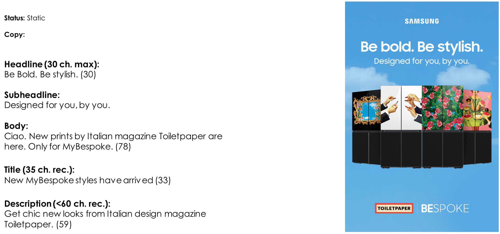 Samsung’s line of Bespoke Appliances is all about innovative technology and inspired aesthetics. So when it came time to partner with Italian design mavens TOILETPAPER on a limited edition collection of customizable MyBespoke fridge panels, our task was simple: make everything POP on social and cook up a delicious landing page experience for dessert.